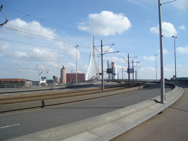 We verlieten het Scheepvaartkwartier om langs de Spido over de Erasmusbrug naar de Kop van Zuid te lopen.