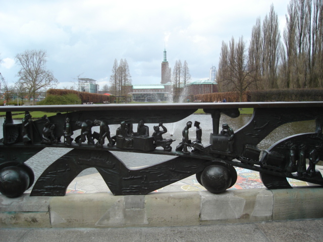 brug in het plantsoen een fraai doorkijkje op smeedijzeren voorstelling van Rotterdamse nijverheid en Museum Boymans op de achtergrond.